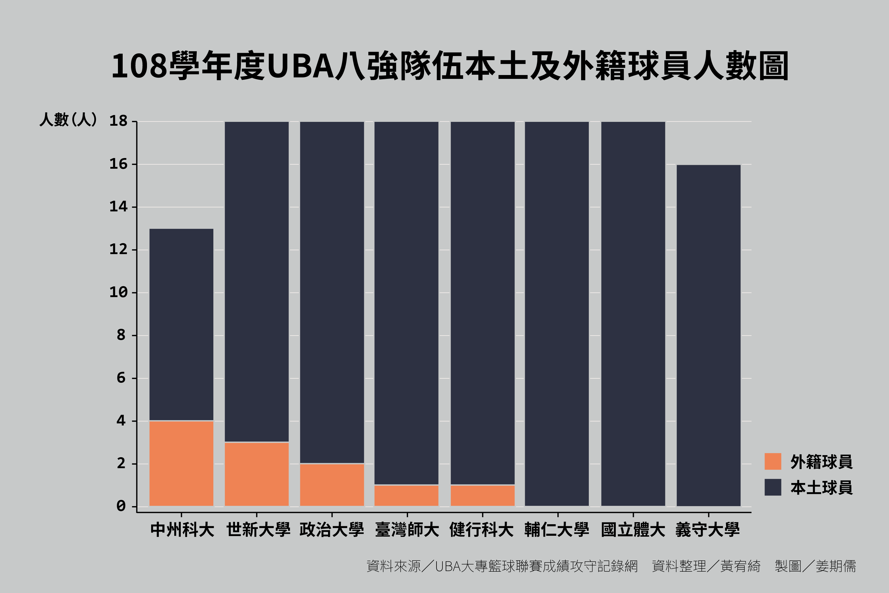 近年來,UBA缺乏長人,為了補足隊上內線戰力,眾多學校找來身高近200公分的外籍球員助陣。108學年度16支公開一級賽的參賽隊伍中,有超過三分之一的隊伍擁有外籍球員,世新大學更是有三名外籍球員坐鎮。今年最終打進四強的隊伍中,就有三隊擁有外籍球員,分別為:國立臺灣師範大學澳門籍容毅燊、中州科技大學塞內加爾籍斑霸(Sarr