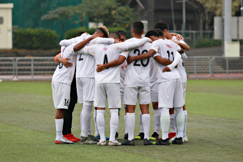 全由巴西球員組成的南華大學足球隊,賽前球員圍圈祈禱,期盼能拿下比賽勝利。 圖/黃宥綺攝