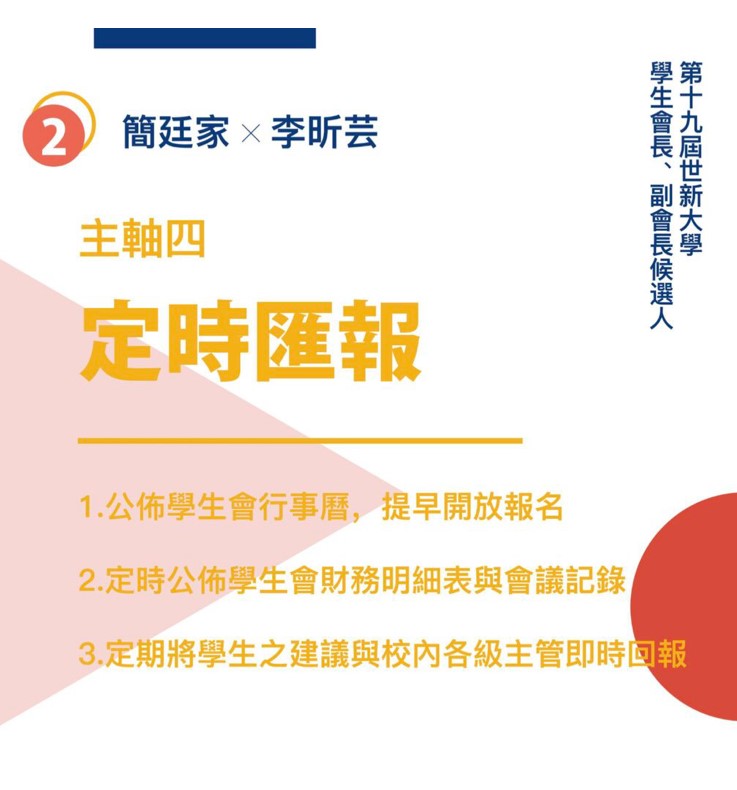 現任世新大學學生自治會會長、副會長,在選舉時,提出的政見主軸四,包含定時公布學生會財務明細與會議紀錄。 圖/取自簡廷家×李昕芸粉絲專頁