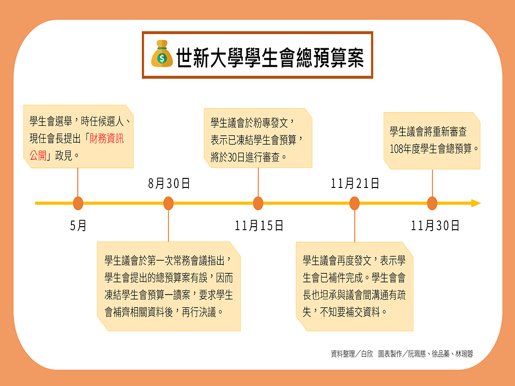 《世新大學學生自治會法規彙編》(以下簡稱自治會法規)規範,經議會三讀通過後才可公布財務資訊,未來通過後,會公告於臉書粉專等社群媒體。學生會會長、世新行政管理學系學生簡廷家允諾,將在30日審查過後,公開相關資料。